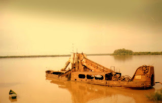 El Uruguay atravesado por una crecida, y un viejo barco arenero semi hundido